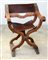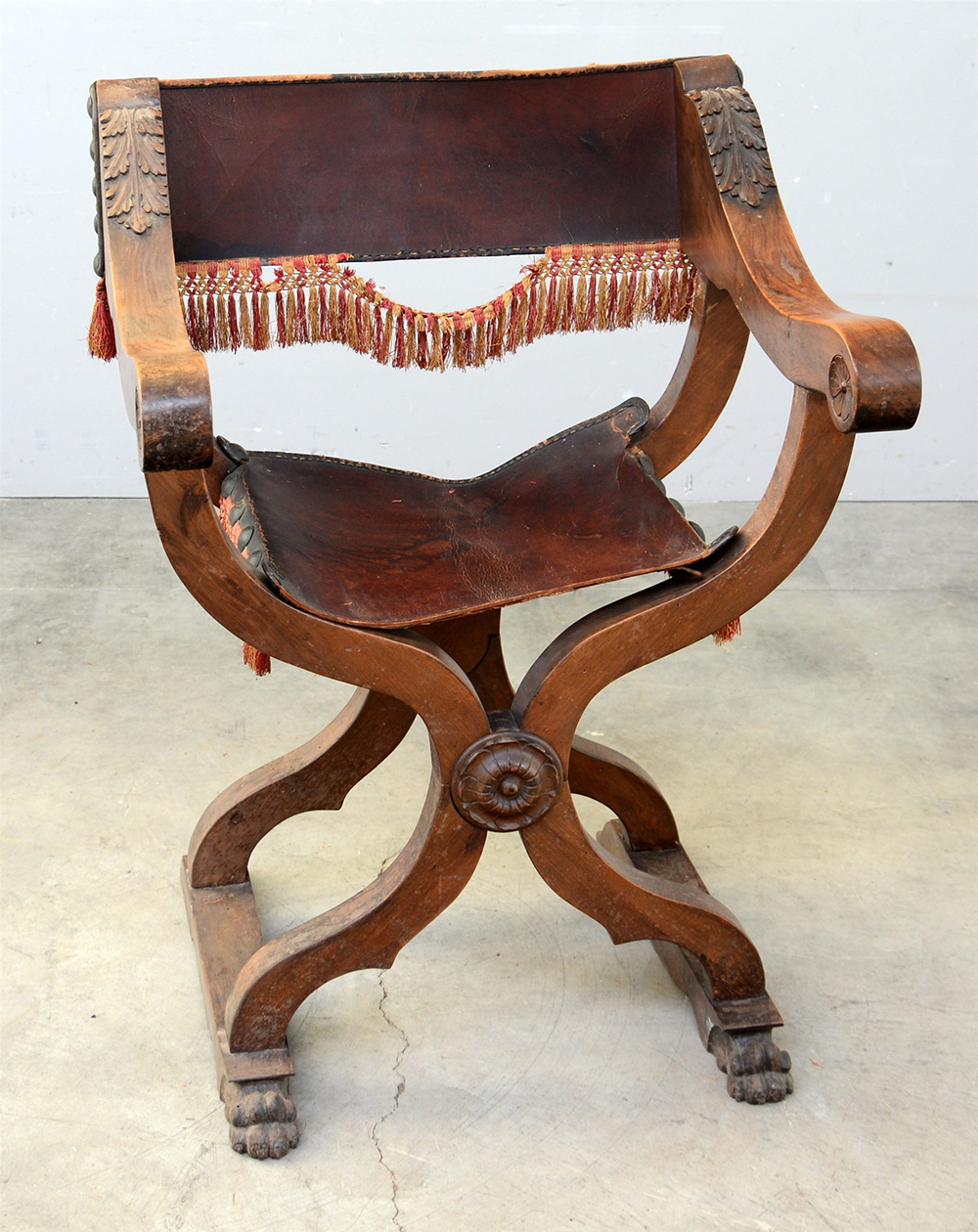 Poltrona "Savonarola" con braccioli intagliati a motivi vegetali e rosoni, piedi a zampa ferina, schienale e seduta in cuoio (difetti)