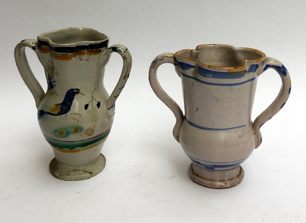 Lotto di due vasi biansati in maiolica con decori diversi (h cm 20) secolo XIX (difetti e restauri)