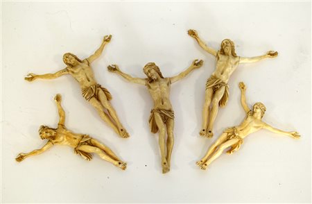 Arte del secolo XIX. Gruppo di cinque sculturine in diversa fattura in avorio raffiguranti Cristo Crocifisso (difetti)