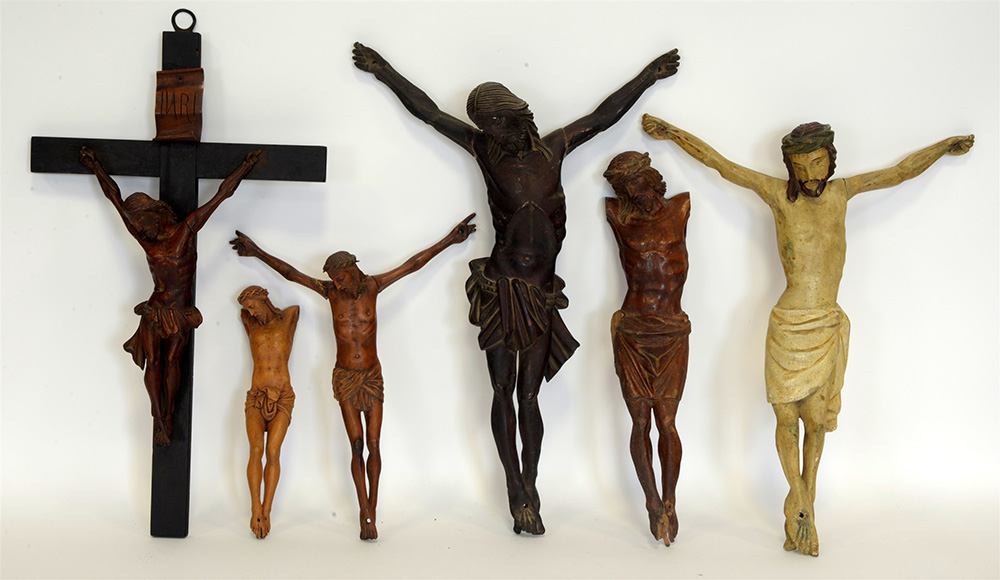 Lotto composto da sei sculture in legno raffiguranti Cristo Crocifisso di cui uno in policromia (difetti e mancanze)