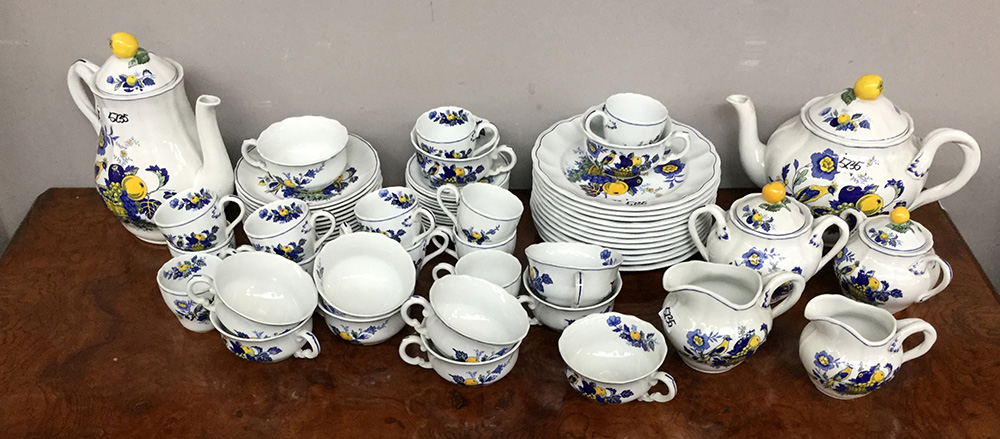 Manifattura inglese, servizio da the e caffè in ceramica policroma composto da una caffettiera, una teiera, due zuccheriere, due lattiere, dodici piattini da dolce, dodici tazzine da the con piattini e dodici tazzine da caffè con piattini decorati a fiori, frutti e pennuti nei toni del giallo e blu su fondo bianco