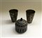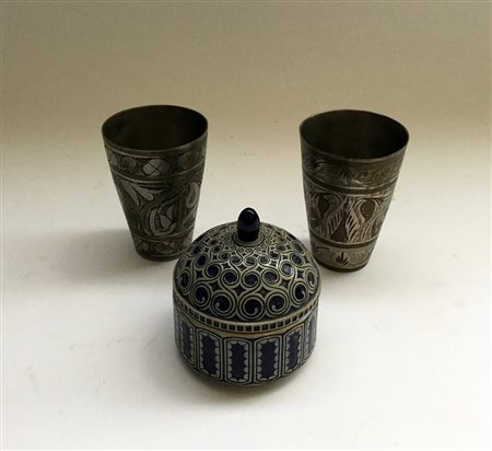 Manifattura turca, lotto composto da un contenitore con coperchio in ceramica e due bicchieri in metallo decorati con incisioni, misure differenti (lievi difetti)