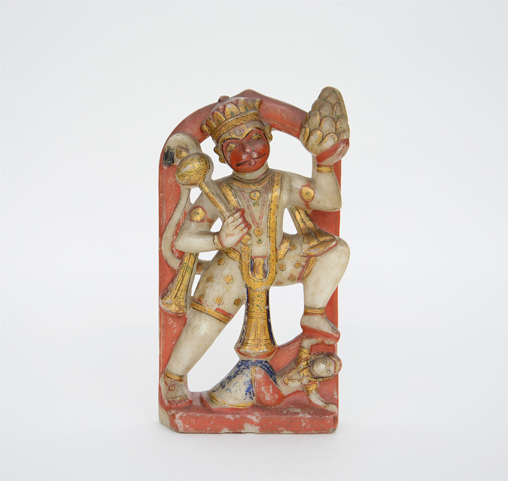 Scultura in alabastro raffigurante scimmia con corona con pigmenti e doratura. Manifattura indiana (h. 29 cm.)