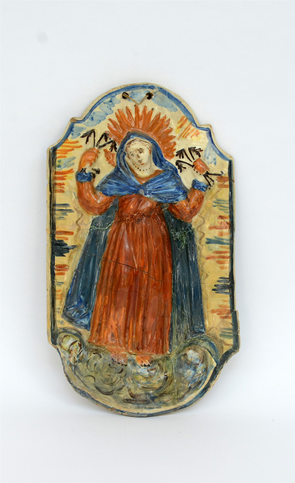 Targa in maiolica policroma con figura a rilievo da stampo raffigurante la Madonna dei Sette Peccati (cm 19 x 33). Italia meridionale, XIX secolo (restauri)