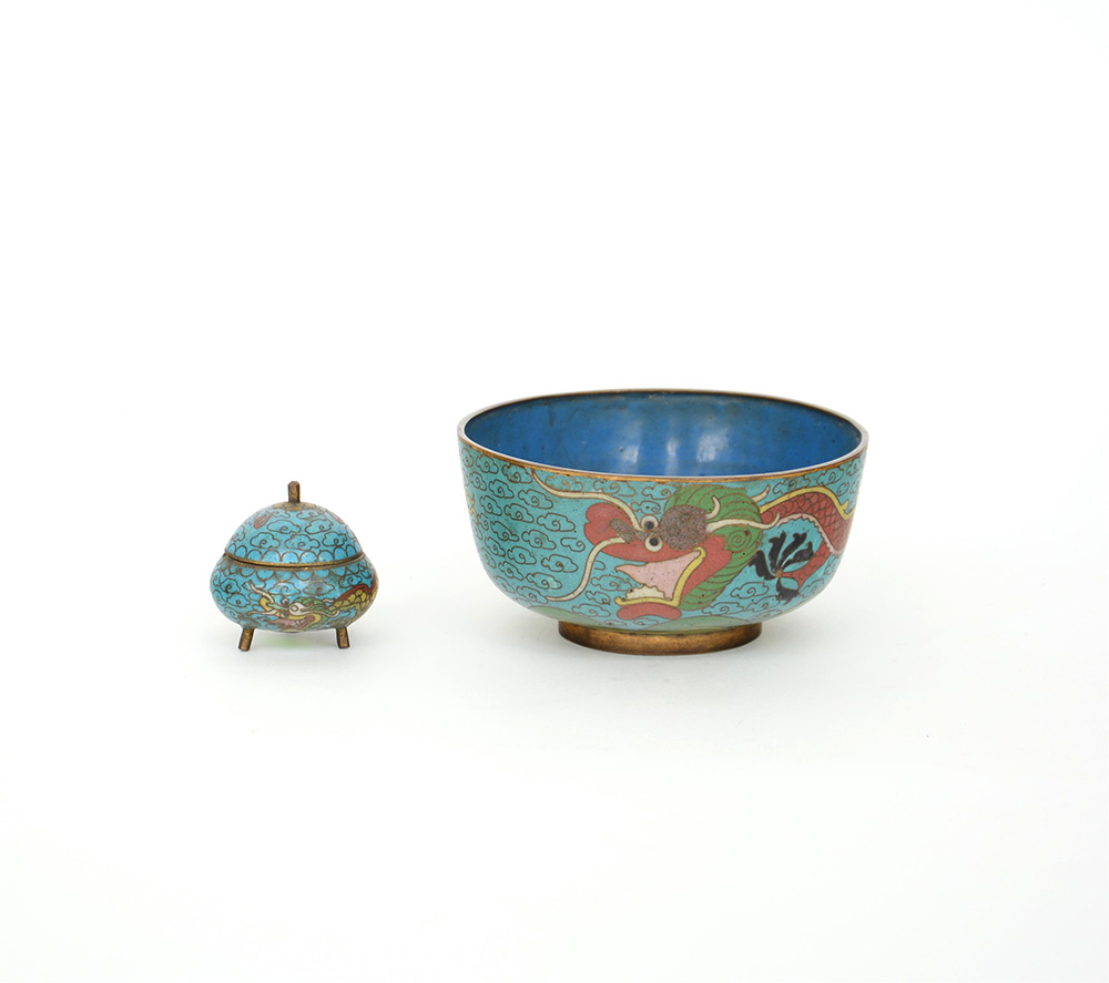 Una scatolina e una ciotola in metallo cloisonnè a fondo turchese di manifattura cinese moderna (d. max. 11 cm.)