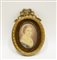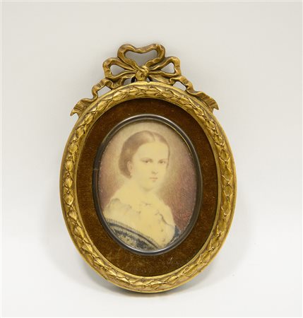 Secolo XIX "Ritratto di donna" miniatura (cm 6x4,5) con cornice in bronzo con cimasa con fiocco