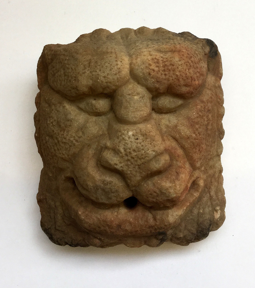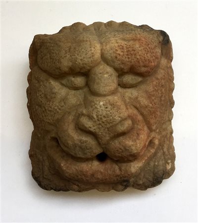 Antico mascherone per fontana in pietra scolpita a figura di leone (cm 16x14) (difetti)