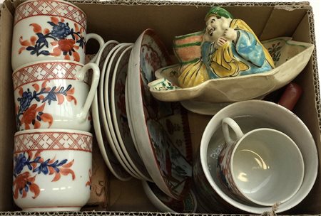 Manifattura orientale, lotto composto da alcune tazzine, piattini e altri oggetti in ceramica. In cartone (difetti)
