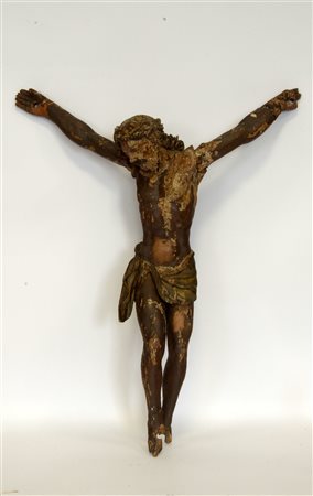 Cristo crocefisso in legno con tracce di policromia. Manifattura del sec. XVII (cm 88) (difetti e mancanze)