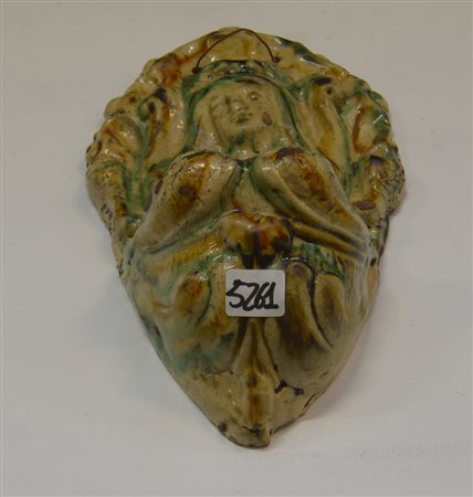 Manifattura di Ariano Irpino, sec XVIII Acquasantiera in ceramica ingobbiata ed invetriata con decorazione a rilievo eseguita a stampo (h. cm. 25,5) (difetti, cadute di smalto e sbeccature)