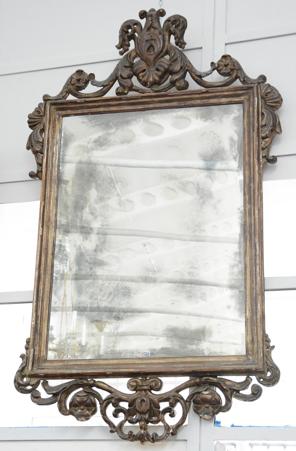 Specchiera in legno intagliato e dorato a mecca a volute, fiori e motivi vegetali. Secolo XIX (cm 161x96)(difetti)