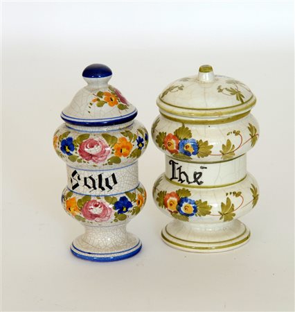 Due piccoli albarelli a rocchetto con coperchio in maiolica policroma e decoro a fiori. Misure diverse (difetti)