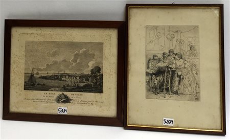 Lotto composto da due stampe monocrome raffiguranti "Interno di bistrot" e "Veduta portuale" misure differenti, in cornici (difetti)