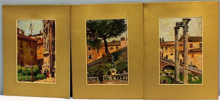 Lotto composto da tre paesaggi, olii su cartone pressato (cm 24x15,5 circa) firmati in basso a destra.