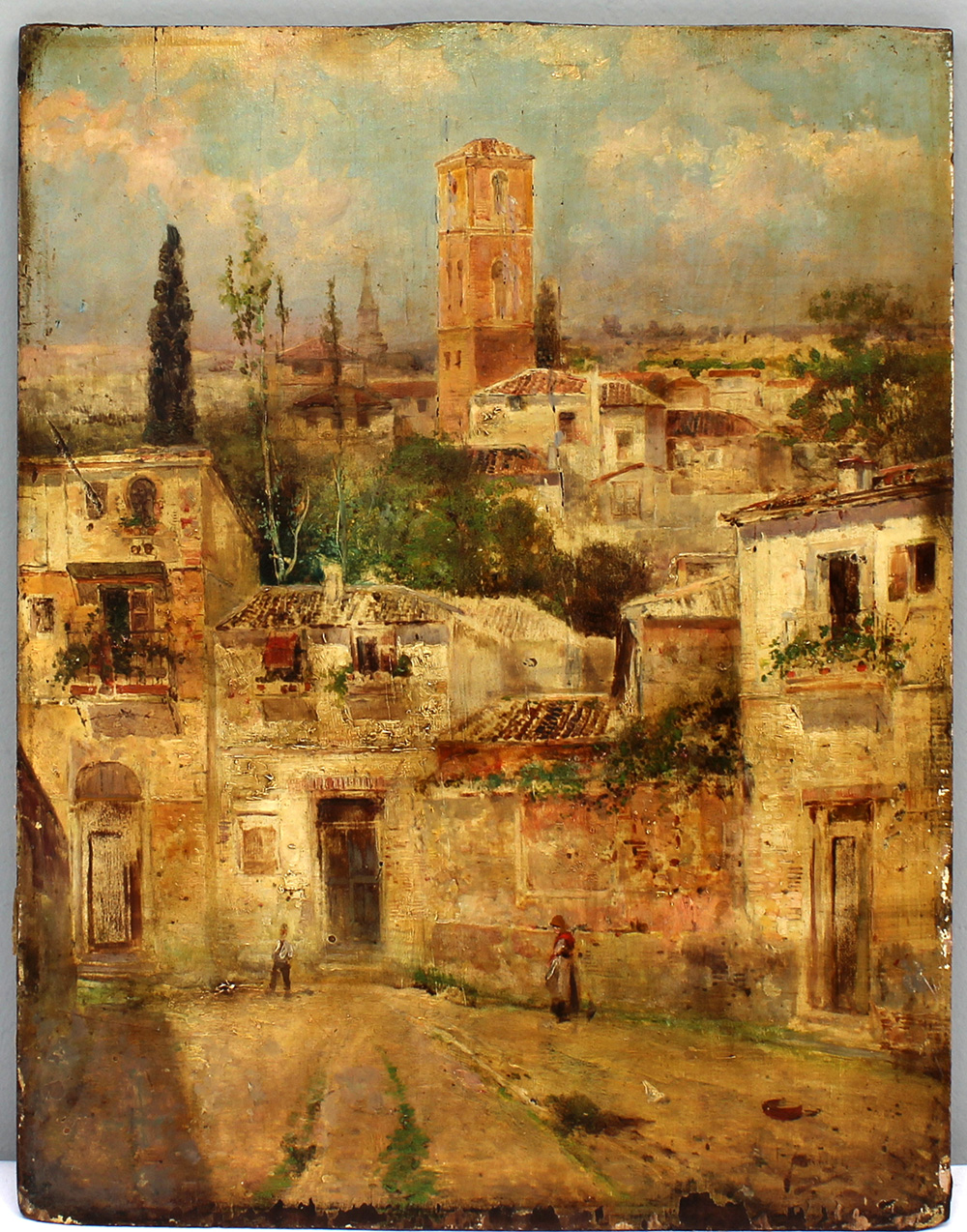 Scuola del Secolo XIX, "Paesaggio" olio su tavoletta (cm 34,5x26,5) firmato in basso a destra (difetti)