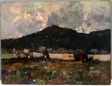 Romolo Leone (Napoli 1883 - 1958)""Barche" olio su tavoletta (cm 23x31)...
