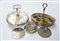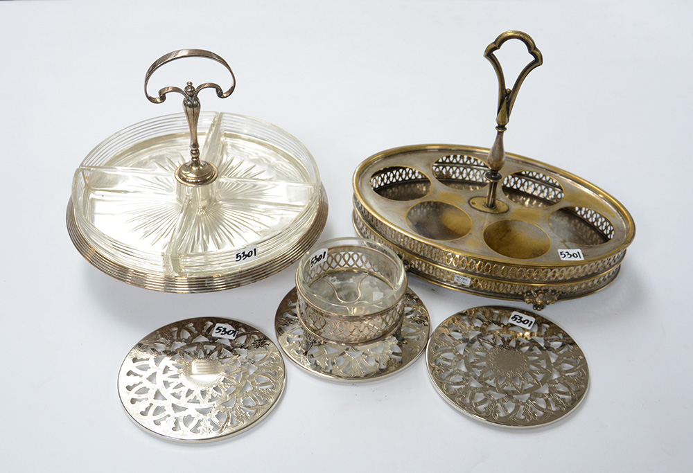 Lotto composto da un portacondimenti, tre sottopentola, un'antipastiera ed una formaggera in metallo argentato e vetro (difetti)