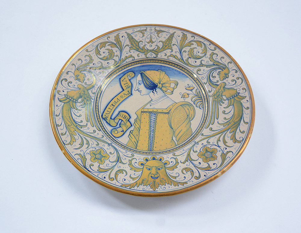 Manifattura di Deruta, piatto da parete in maiolica decorato a motivi rinascimentali (d cm 34)