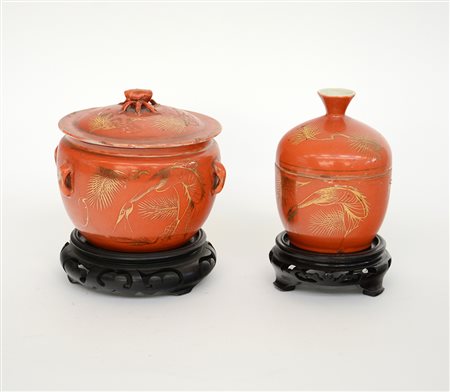 Due ciotole con coperchio in porcellana rosso corallo con decorazione dorata, una base in legno. Cina sec. XX (h. max 12 cm.)
