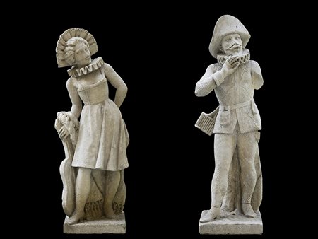 Venetian art "Masks" a pair of stone sculptures (h. cm 142) (defects and losses)