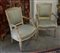 Coppia di poltrone in legno laccato e dorato con schienale di forma squadrata. Braccioli mossi. Napoli, secolo XVIII (difetti)