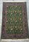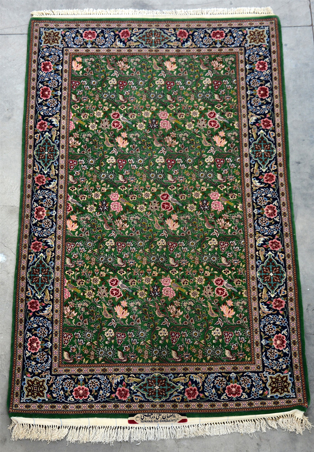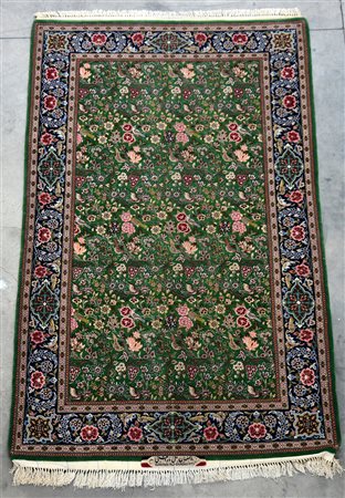 Tappeto annodato in lana e seta su ordito e trama in seta. Decoro con rami fioriti ed uccelli policromi su fondo verde smeraldo e bordura a fondo blu. Cartiglio con scritta in farsi e caratteri latini. (cm 203x124) (lievi difetti)