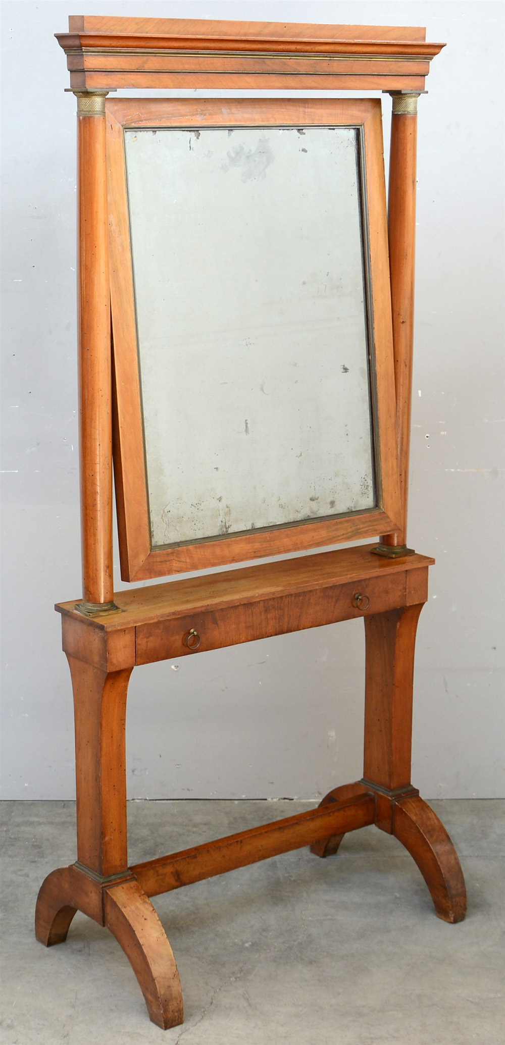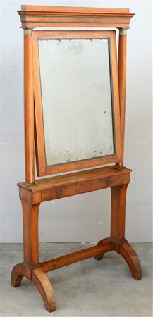 Psiche "Impero" con specchio basculante e cassetto nella fascia. Montanti a colonna tornita con capitelli dorati. Gambe sagomate riunite da traversa. Secolo XIX (cm 174x80) (difetti)