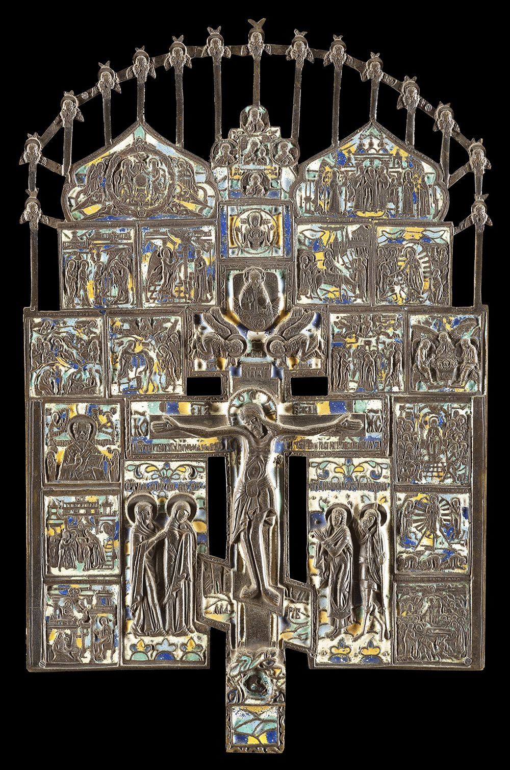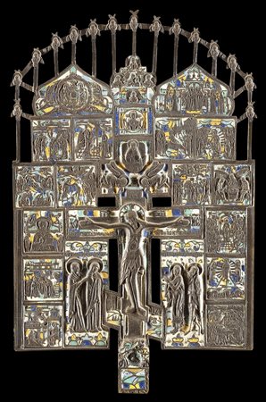 Icona russa in bronzo e smalti raffigurante Cristo crocifisso e scene della vita di Cristo. Russia, secolo XIX (cm 38x22)