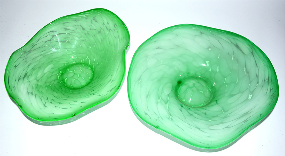 Lotto composto da due centrotavola a bordo sagomato in vetro policromo verde (d max cm 37)