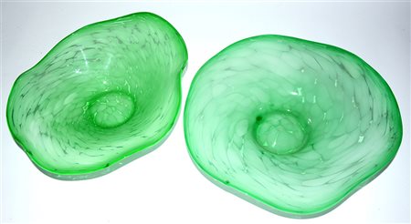 Lotto composto da due centrotavola a bordo sagomato in vetro policromo verde...
