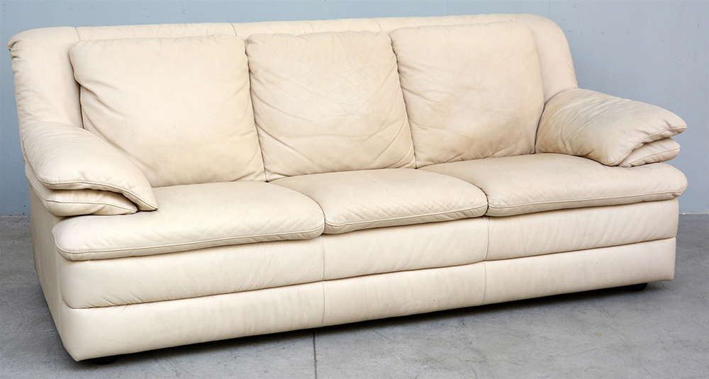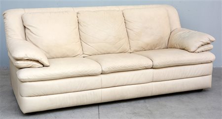 Natuzzi, divano a tre posti in pelle beige con targhetta sul fianco