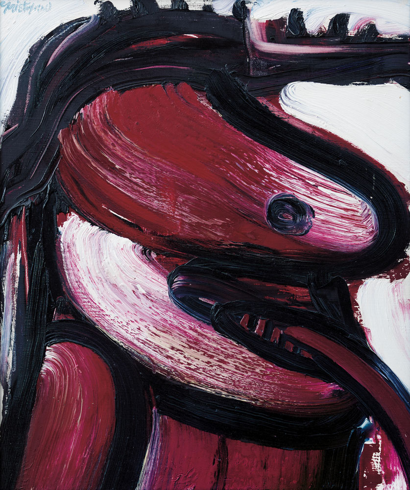JOHN CHRISTOFOROU 1921 - Tireur de langue rouge au chapeau, 1985, olio su tela cm. 55x46, firma in alto a sinistra, titolo, anno e timbro della Galerie Rive Gauche al retro.