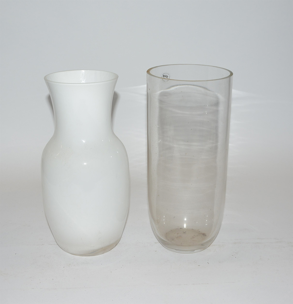 Lotto composto da un vaso a cilindro i vetro trasparente e un vaso a balaustro in vetro opacizzato bianco, misure diverse