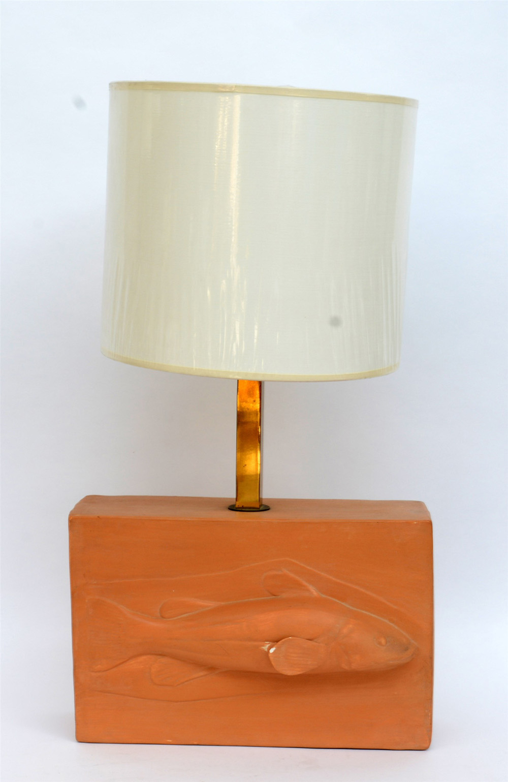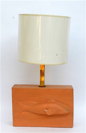 Lampada da tavolo a una luce con basamento in ceramica verniciata raffigurante una pesce in altorilievo su ambo i lati (h tot cm 63) (difetti)