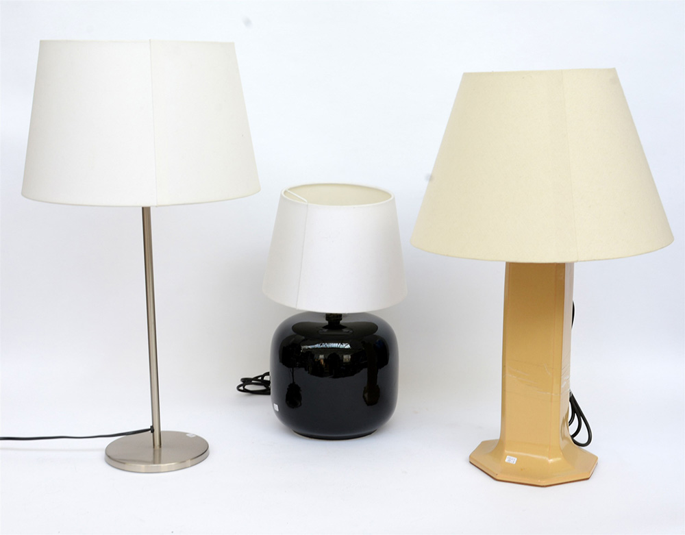 Lotto di tre lampade da tavolo a una luce. Ceramica e alluminio. Due recanti il marchio Ikea. (difetti)