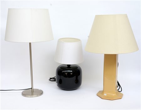 Lotto di tre lampade da tavolo a una luce. Ceramica e alluminio. Due recanti...