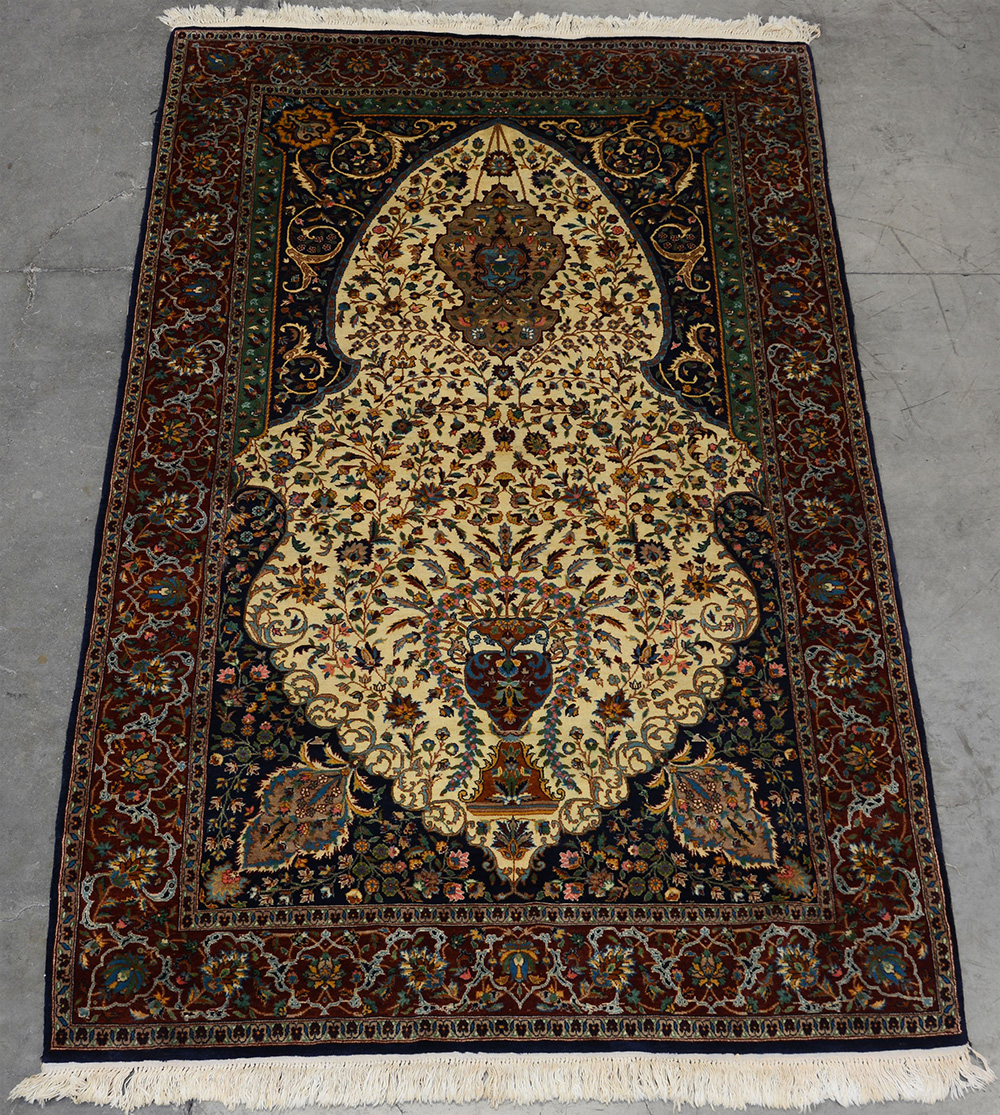 Tappeto Qum, Persia, secolo XX. Disegno a preghiera con mirab decorato da un...
