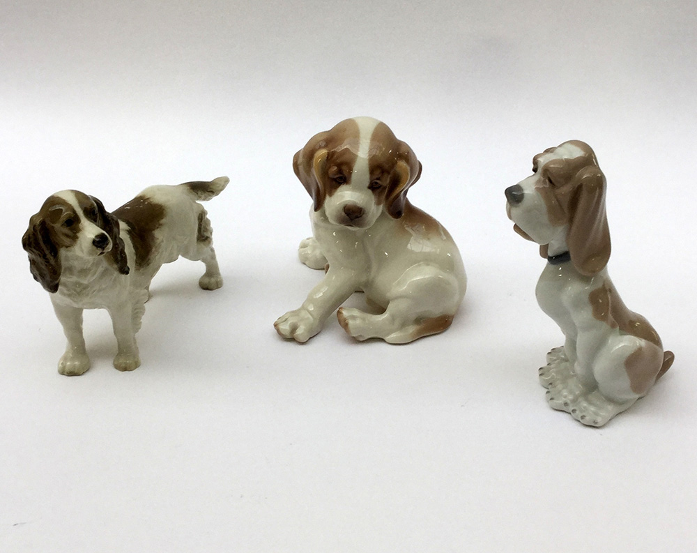 Lotto composto da tre statuette in ceramica raffiguranti cani, di manifatture diverse
