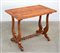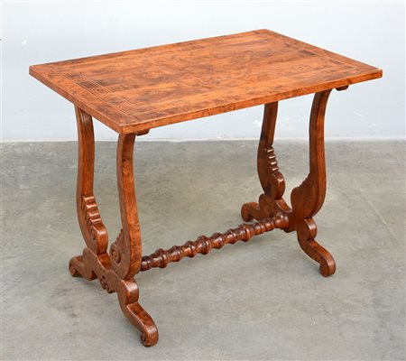 Tavolino con piano rettangolare filettato in legno chiaro, gambe sagomate riunite da traversa tornita (cm 80x65x53) (difetti)