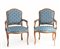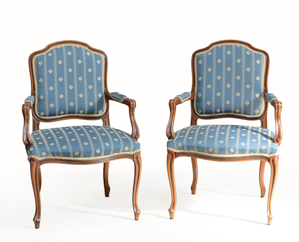 Coppia di poltrone in stile settecentesco rivestite in tessuto blu (difetti)