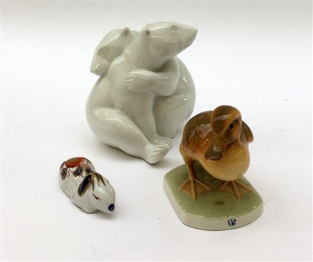 Lotto composto da tre animali in ceramica e porcellana di manifatture diverse raffiguranti orso, anatra e coniglio. Uno marcato "Berlino"