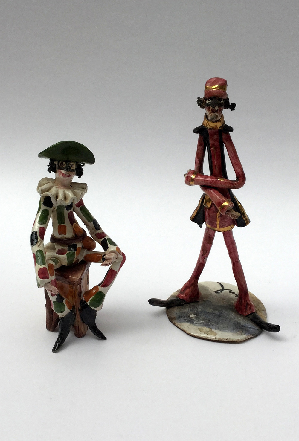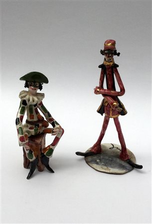 Firme indecifrate. Lotto composto da due personaggi della commedia dell'arte in ceramica smaltata, Italia anni 40 (difetti)