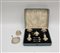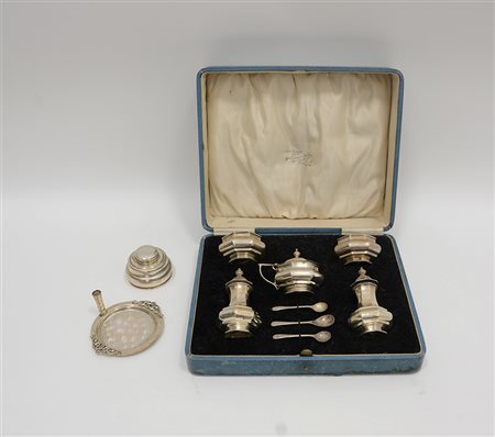 Lotto composto da un piccolo set da condimento formato da due pepiere, due saliere, una mostardiera e tre cucchiaini non pertinenti. In custodia. Londra, 1928. Argentiere Adie Brothers, unito ad un calamaio in argento con piattino portapenne (g tot. 260 ca) (lievi difetti)