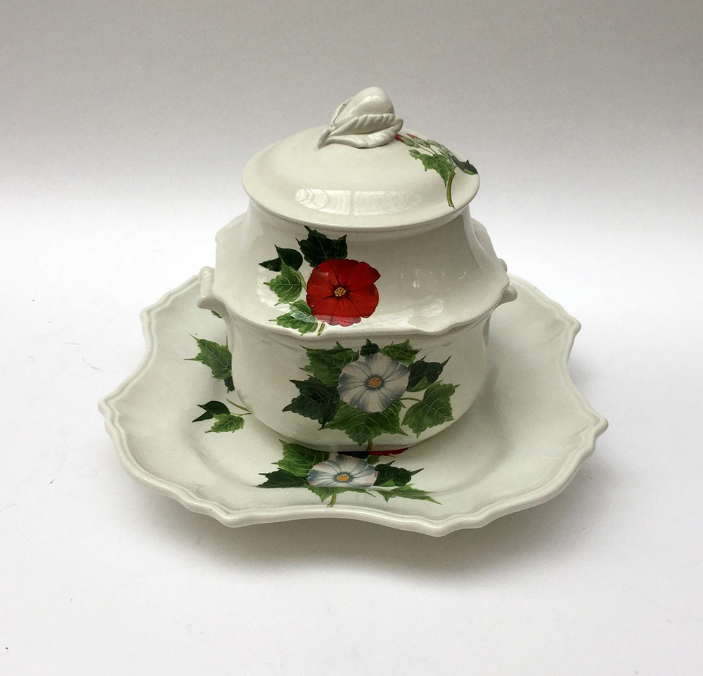 Zuppiera con coperchio e vassoio ceramica decorata a fiori, Este Italia