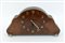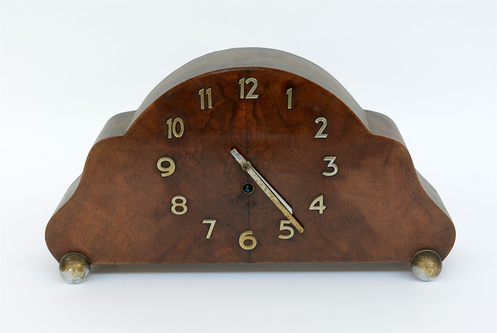 Orologio da tavolo con cassa in legno a profilo sagomato, quadrante con indici in metallo applicati e carica delle ore, piedini sferici in metallo. Anni '30/'40 del secolo XX (cm 40x21x11) (difetti e mancanze)