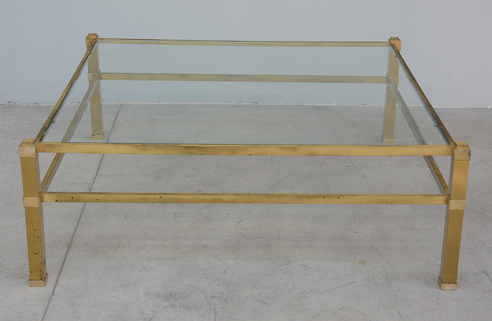 Tavolo da salotto di forma quadrata in ottone, piano in vetro (cm 101x44x101) (difetti, piano scheggiato)