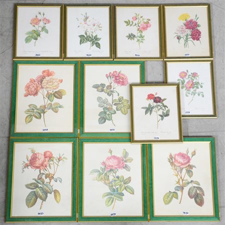 Lotto composto da un gruppo di cinque riproduzioni a colori raffiguranti rose (foglio cm 29x23), e uno da sei riproduzioni raffiguranti fiori vari (cm 23x18), in cornici