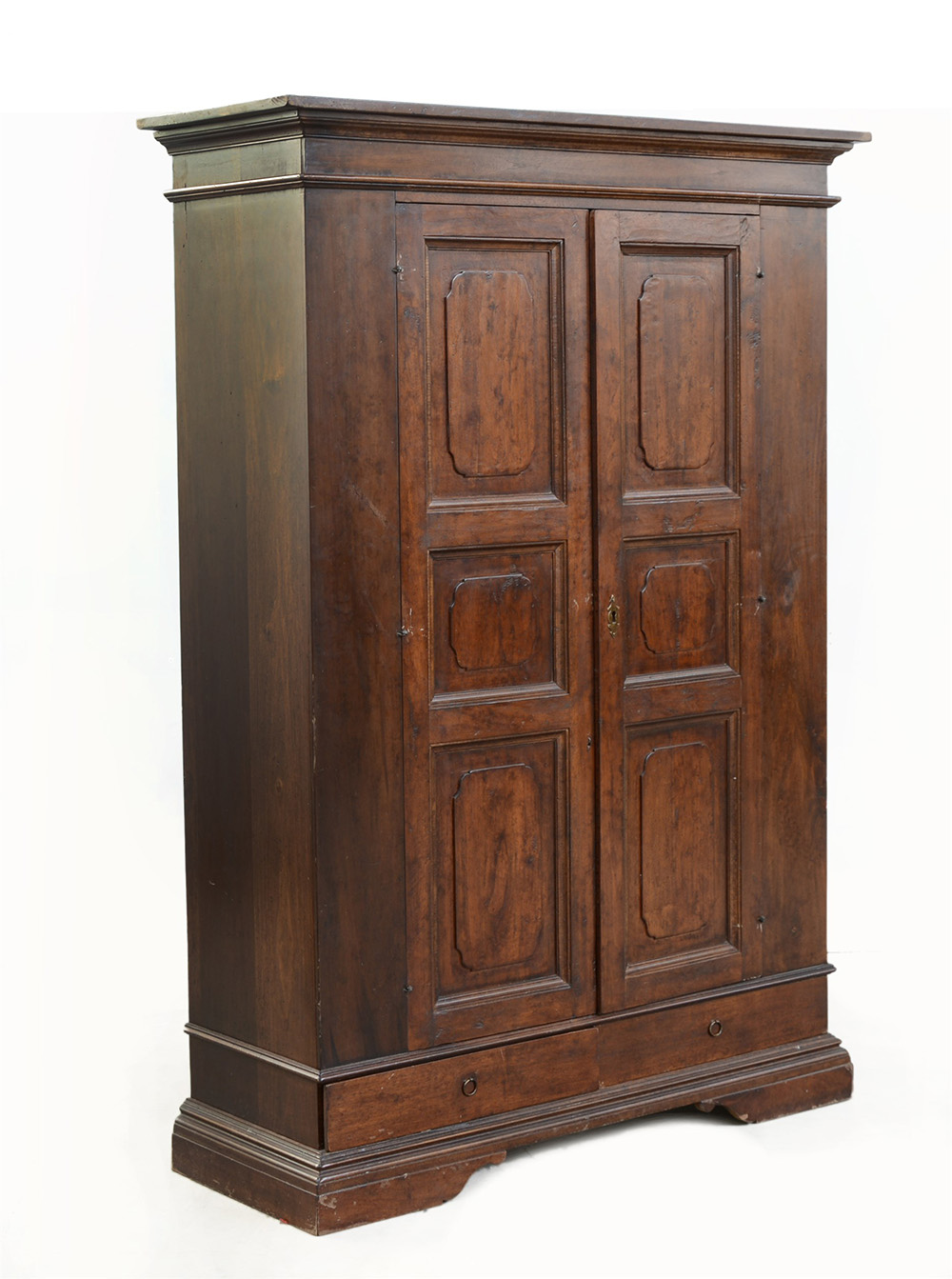 Armadio a due ante riquadrate e pannellate, due cassetti nella base e piedi a mensola (cm 134x188x48) (ante del secolo XIX) (difetti)