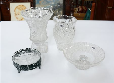 Lotto composto da due vasi e due centrotavola in cristallo molato, vetro e...