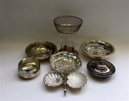 Lotto composto da tre vaschette, un'alzata e tre contenitori in metallo argentato, misure differenti (lievi difetti)